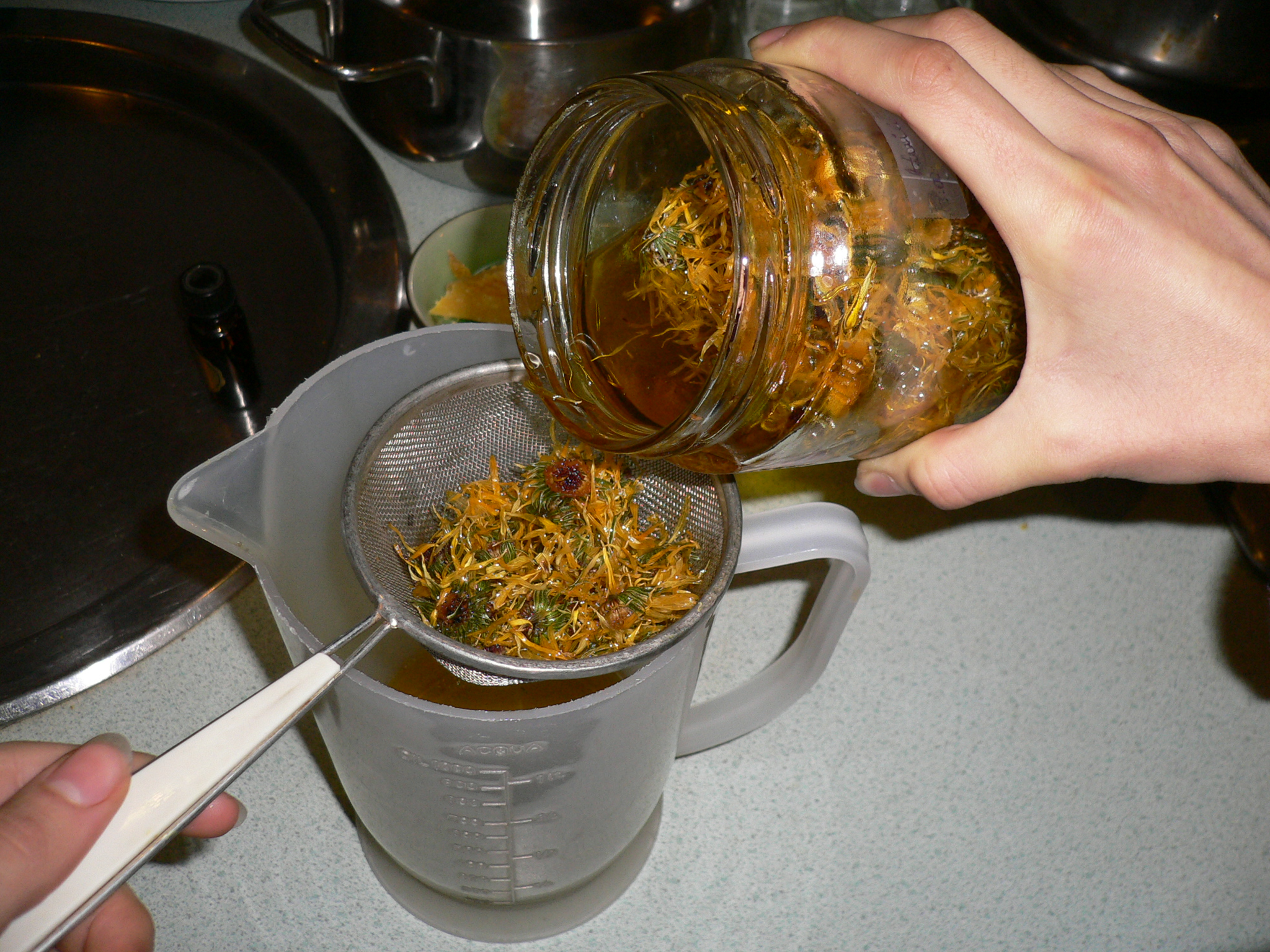 1) faire tremper les fleurs sèches (les fleurs sèches fermentent et moisissent dans l’huile) dans l’huile plus de 2 mois. L’huile d’olive devient à partir de ce moment de l’huile au calendula qui est vendue en pharmacie, sans ordonnance, évidemment très cher : http://www.weleda.fr/fr/les-produits/cosmetiques/huiles-de-massage/huile-de-massage-calendula/