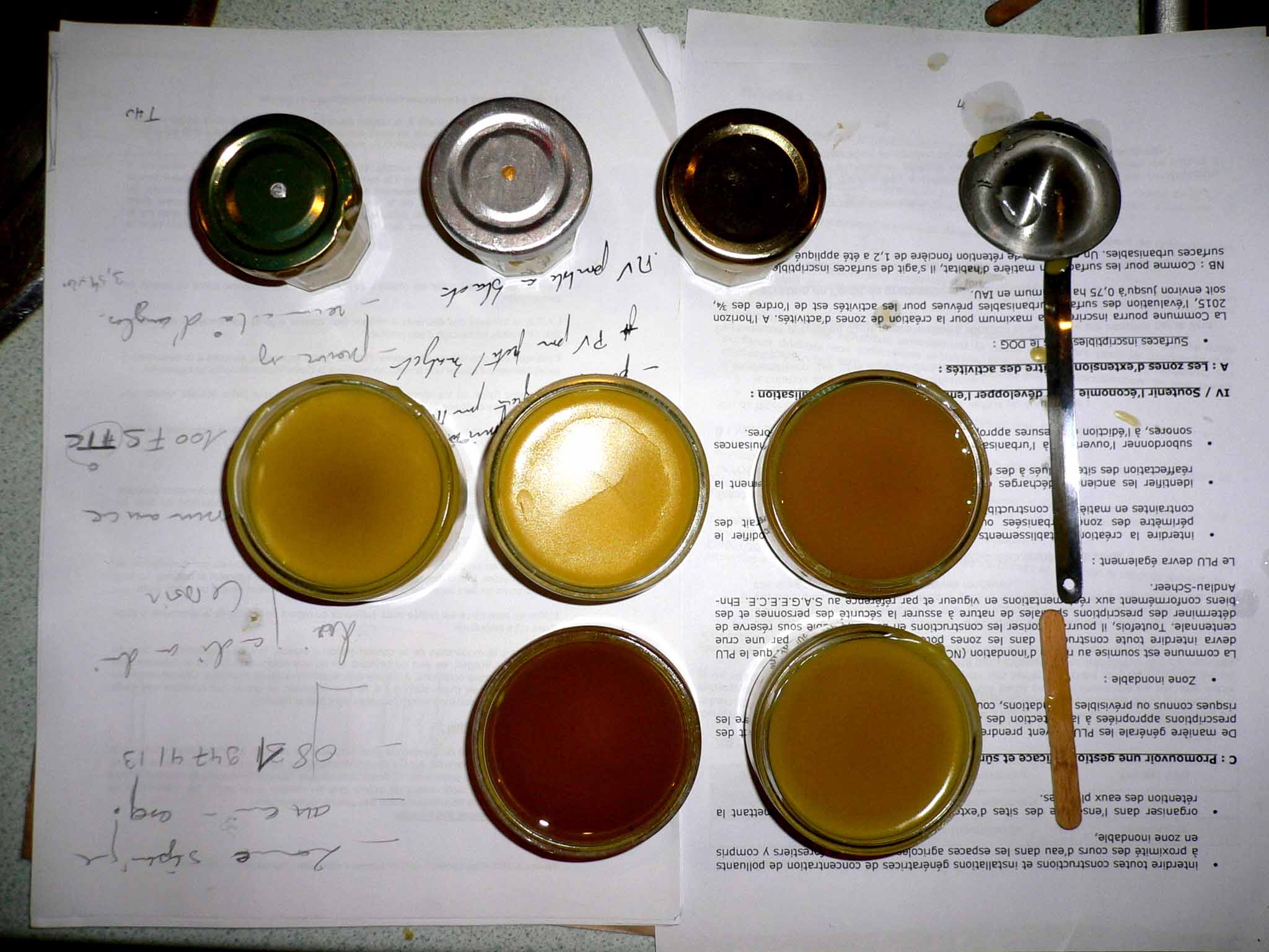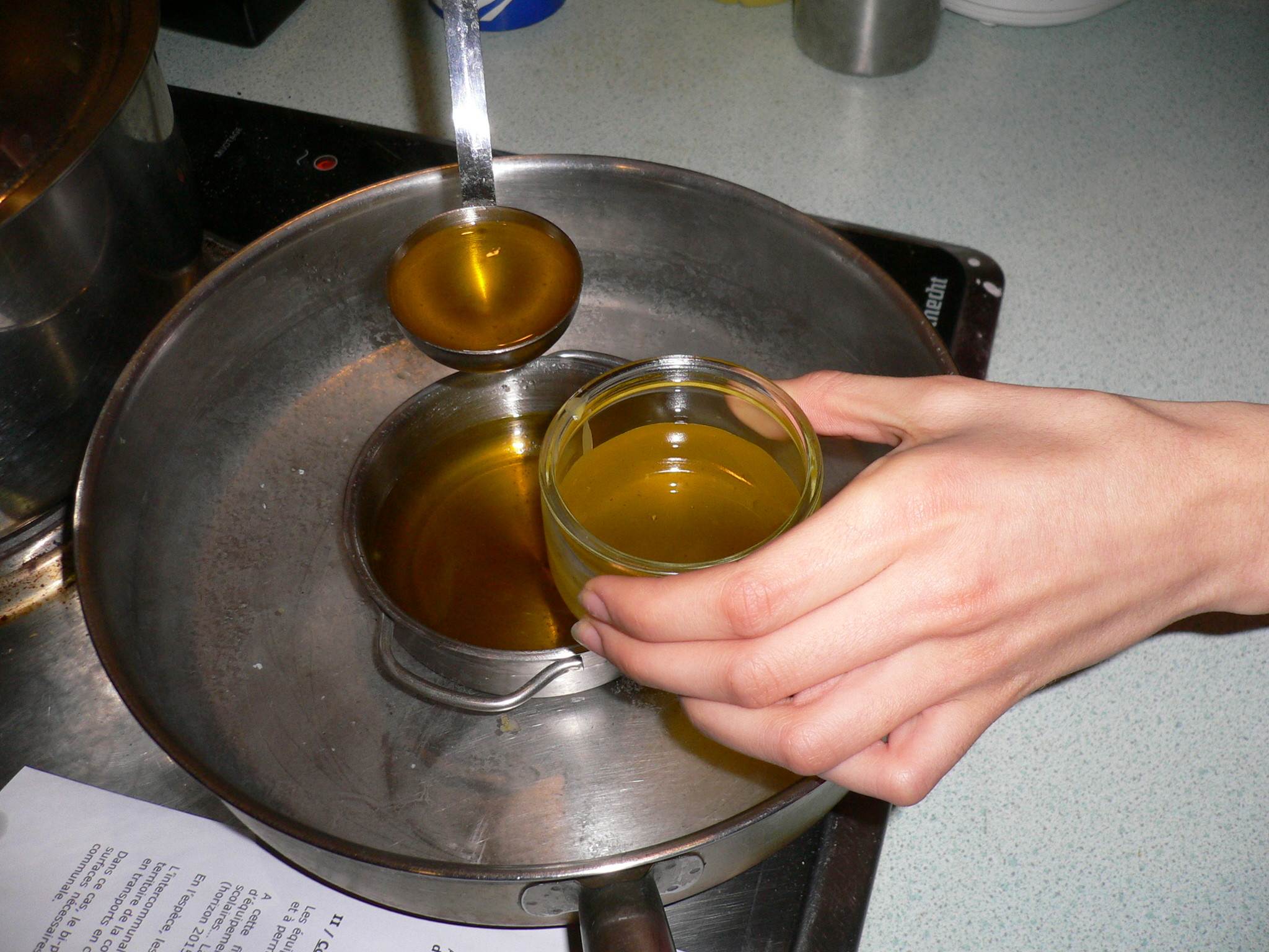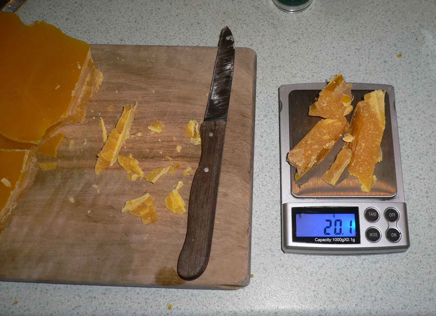 3) peser la cire. Un excès de cire rendra l’onguent plus solide, un défaut de cire l’onguent plus gras.