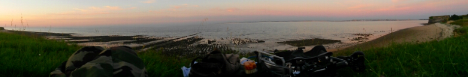 ... une fois arrivé sur l’île, un bivouac devant un parc à huitres à marée basse, en haut d’une petite falaise, face au continent. Tapis dans les herbes, glissé dans mon sursac et le vélo plié, mon campement est totalement intégré dans le paysage.