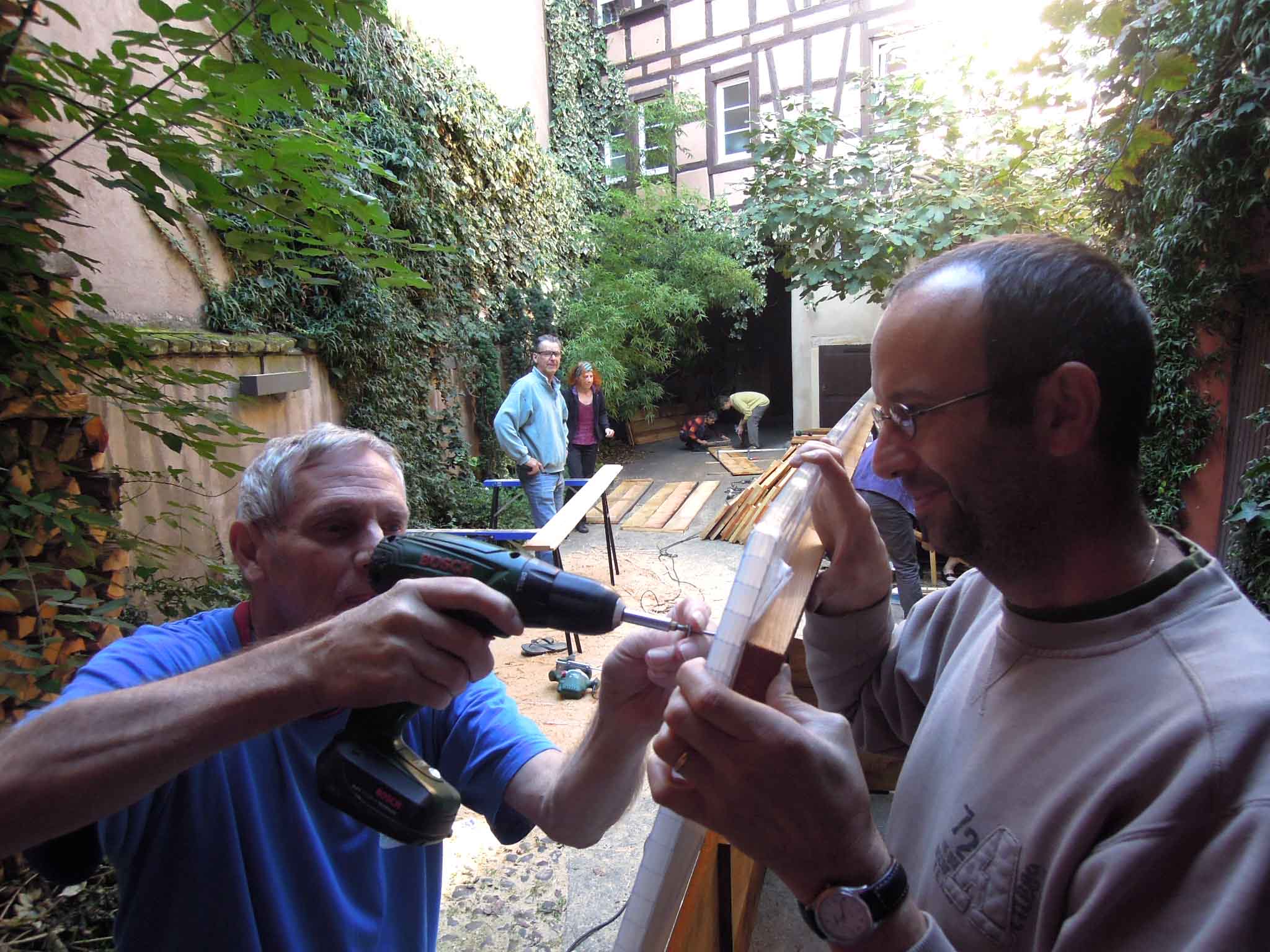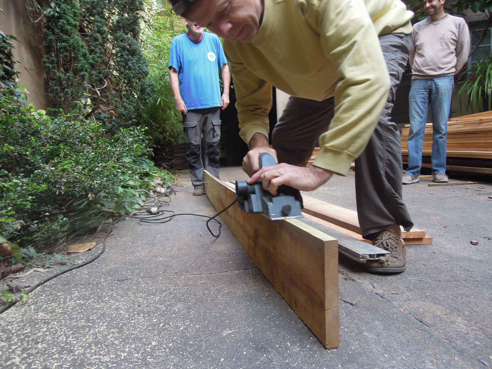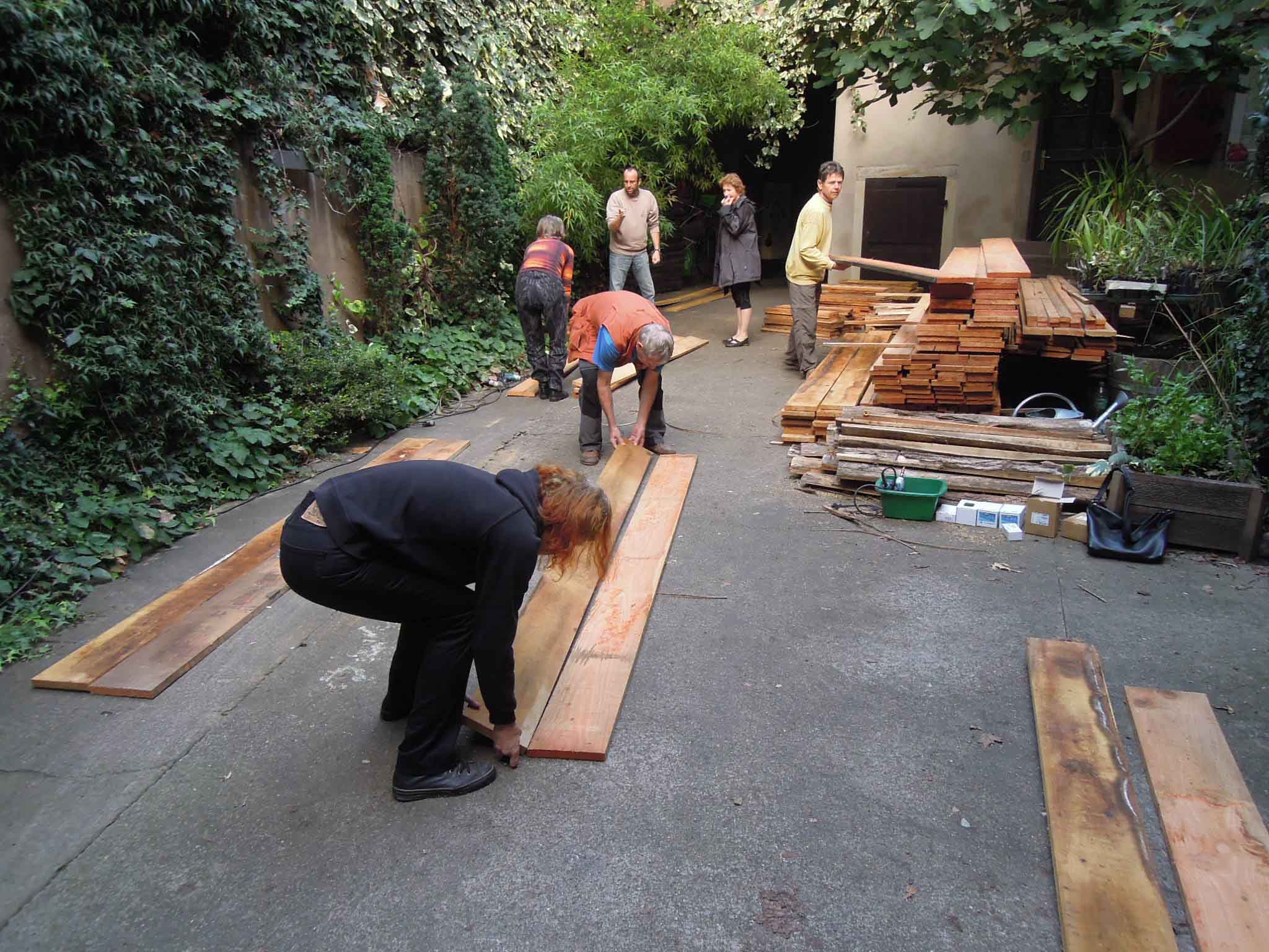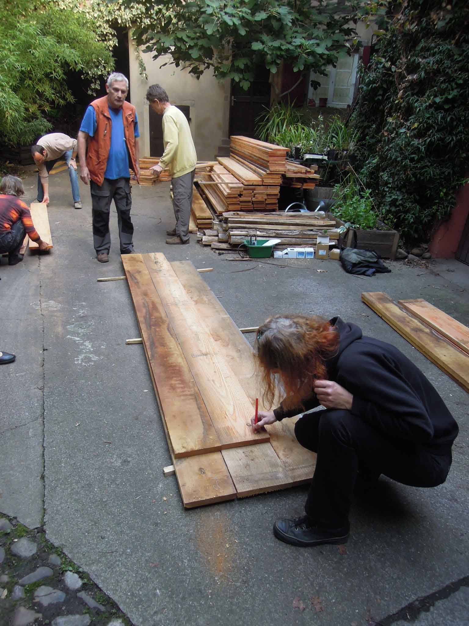 Tri des planches de bois de mélèze et de robinier pour constituer les grands et petits cotés des serres.