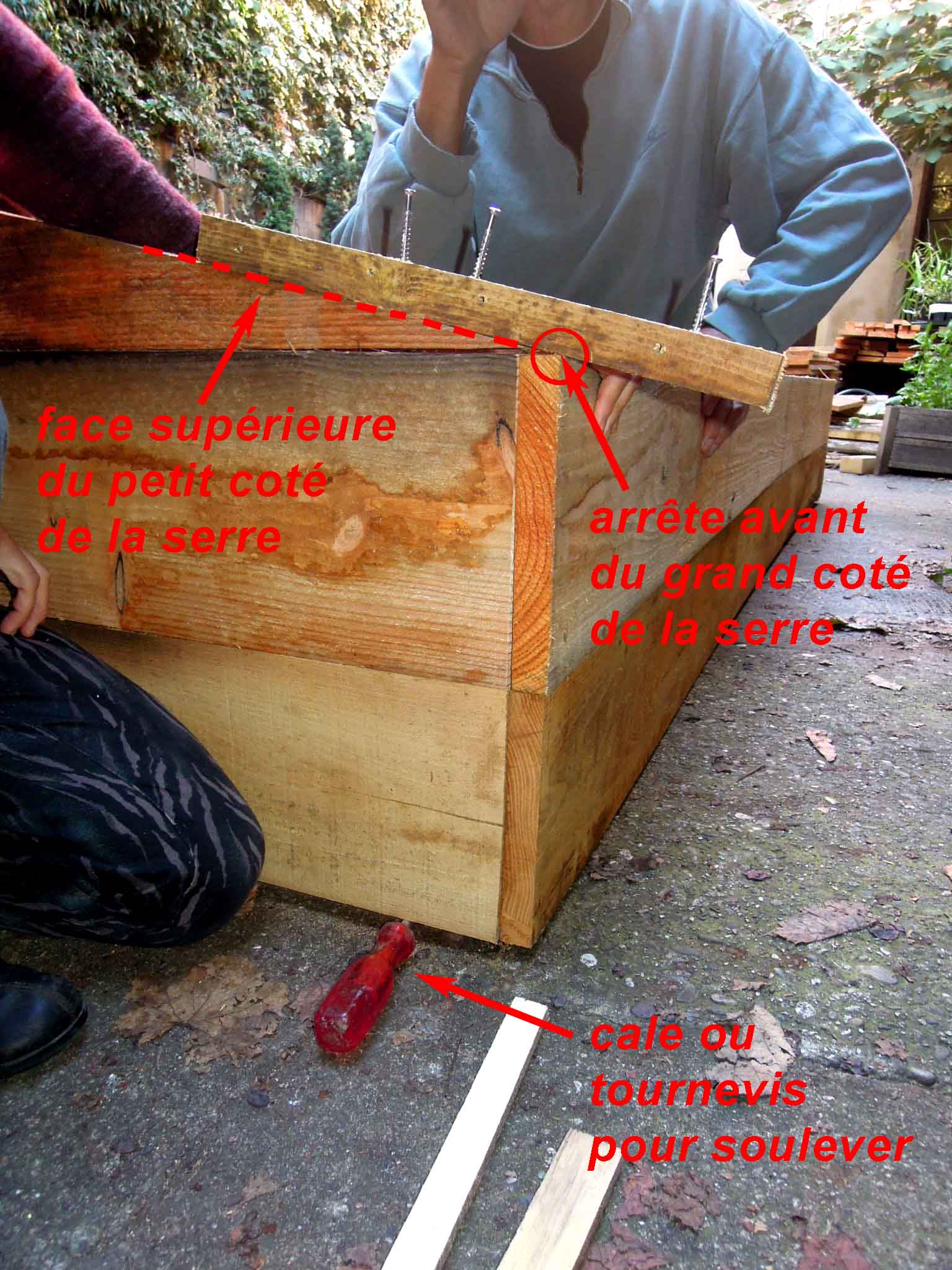 La face supérieure du petit coté des serres doit être parfaitement alignée sur l’arrête arrière (intérieure) du grand coté arrière des serres.