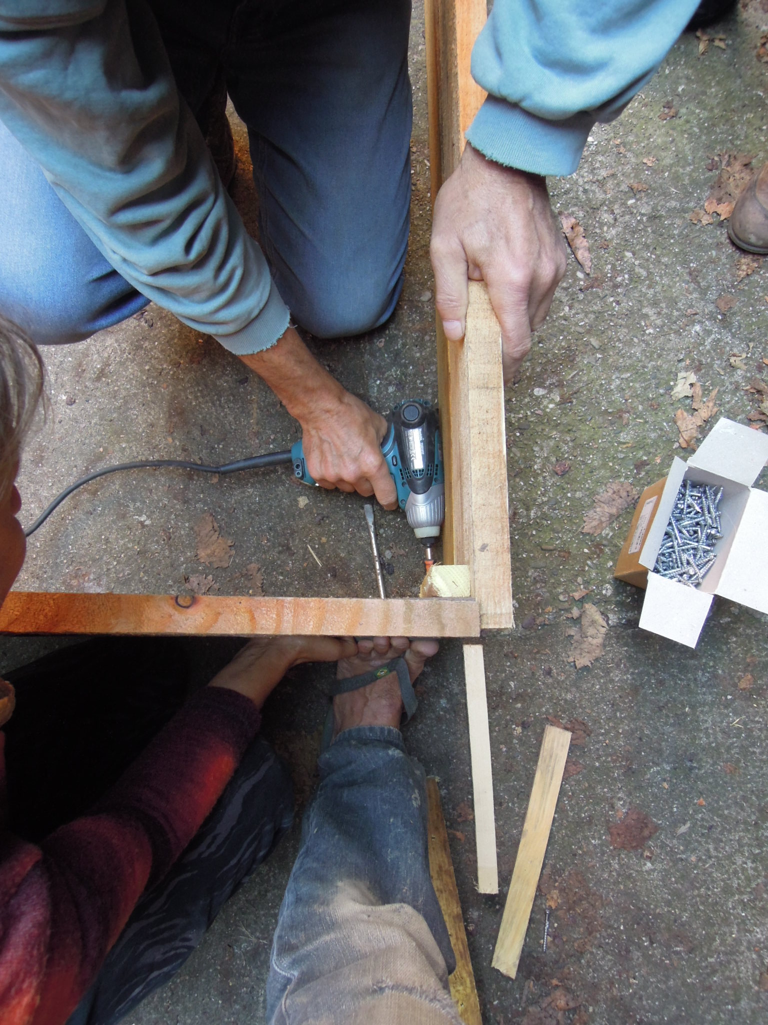 Maintenir fermement les pièces entre elles et contre elles pour ne pas avoir de jeu, et visser jusqu’à ce que les têtes des visses soient noyées.