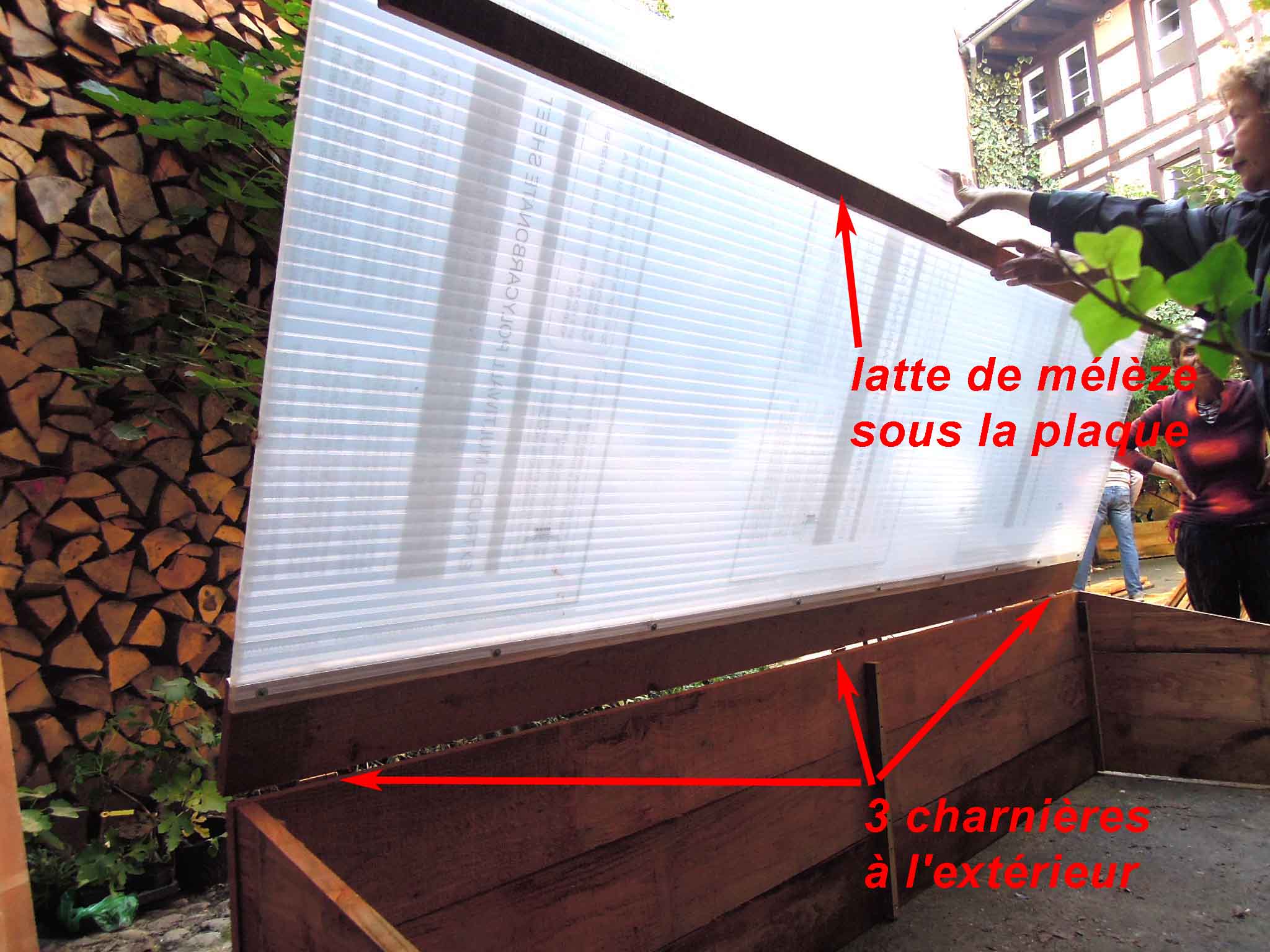 Visser les 3 charnières sur la traverse haute du couvercle, coté extérieur de la serre.