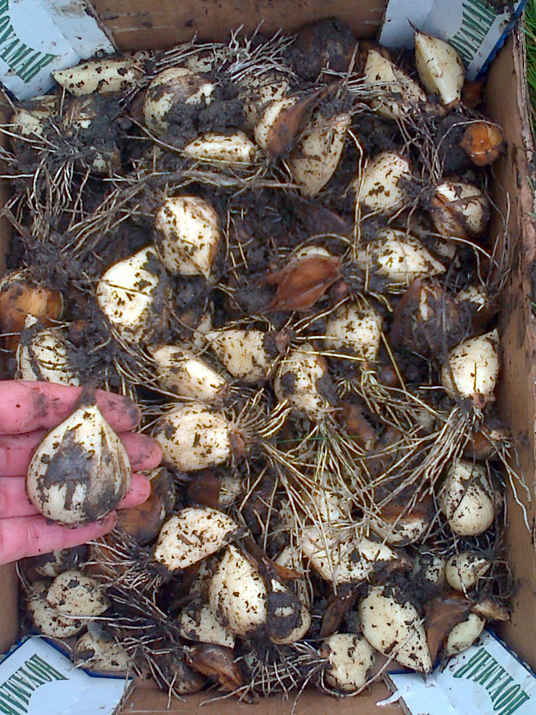 - division après déssèchement de la hampe florale uniquement, arrachage des gousses avec recherche de toutes les bulbilles suspendues aux racines, séparation des caïeux.