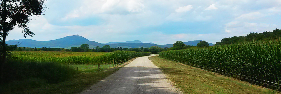 Traversée de la forêt naturelle de l’Illwald au milieu des grandes cultures de la plaine du Rhin, avec les montagnes en arrière plan :