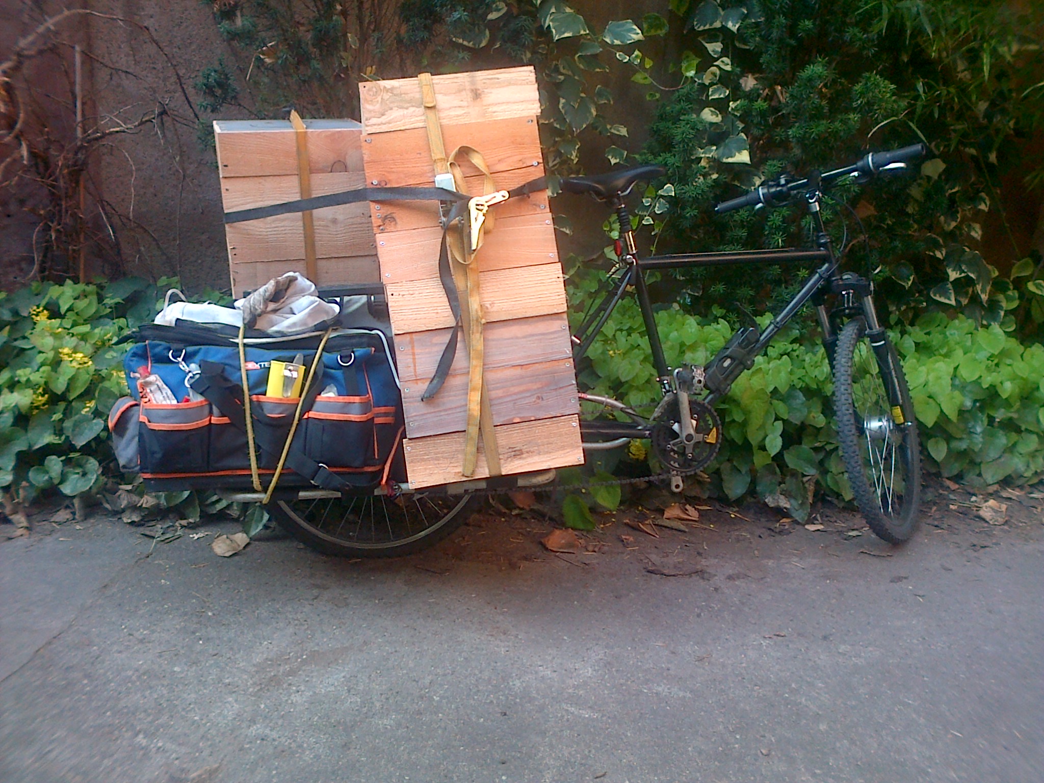 Mon vélo ci-après en situation fréquente avec 3 ruches warré complètes, plus tout le matériel d’apiculture :