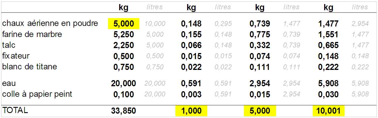 - 1% à 3% du poids de chaux en colle à papier peint si le mur est très poreux