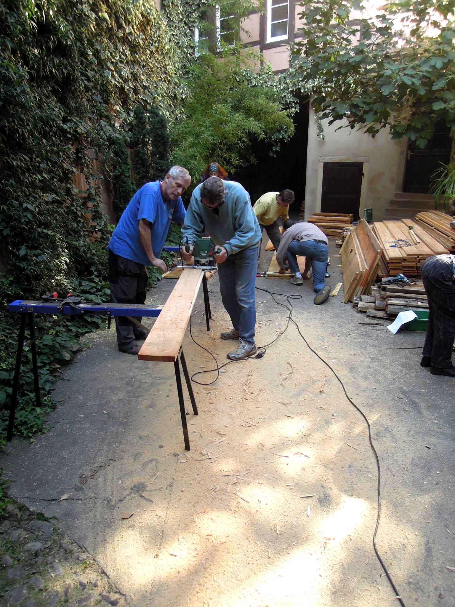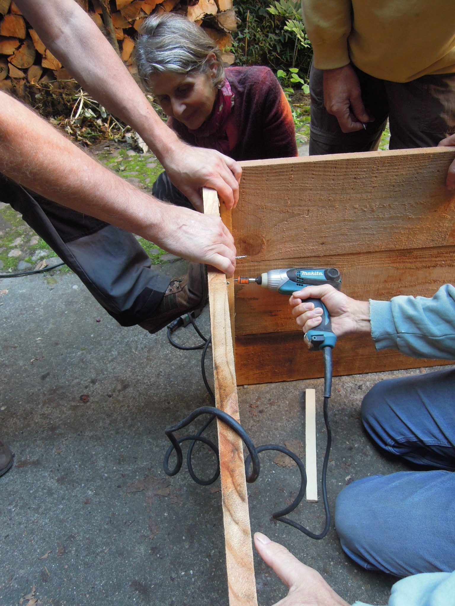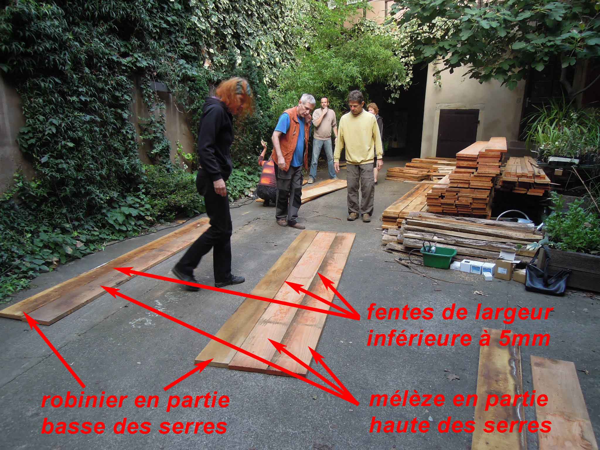 Tri des planches de bois de mélèze et de robinier pour constituer les grands et petits cotés des serres.