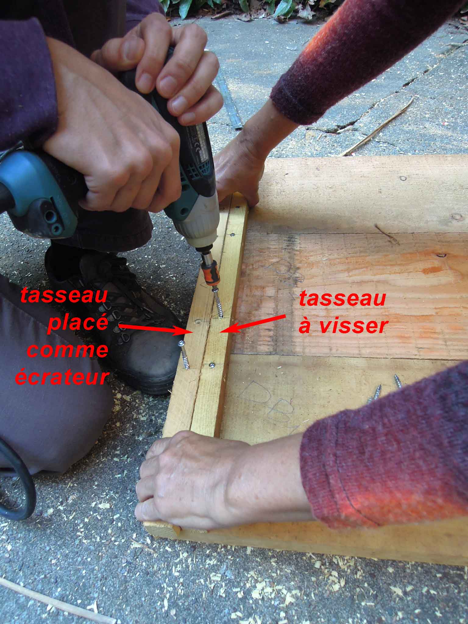 - 2 tasseaux aux extrémités mais en retrait de l’épaisseur d’un tasseau.