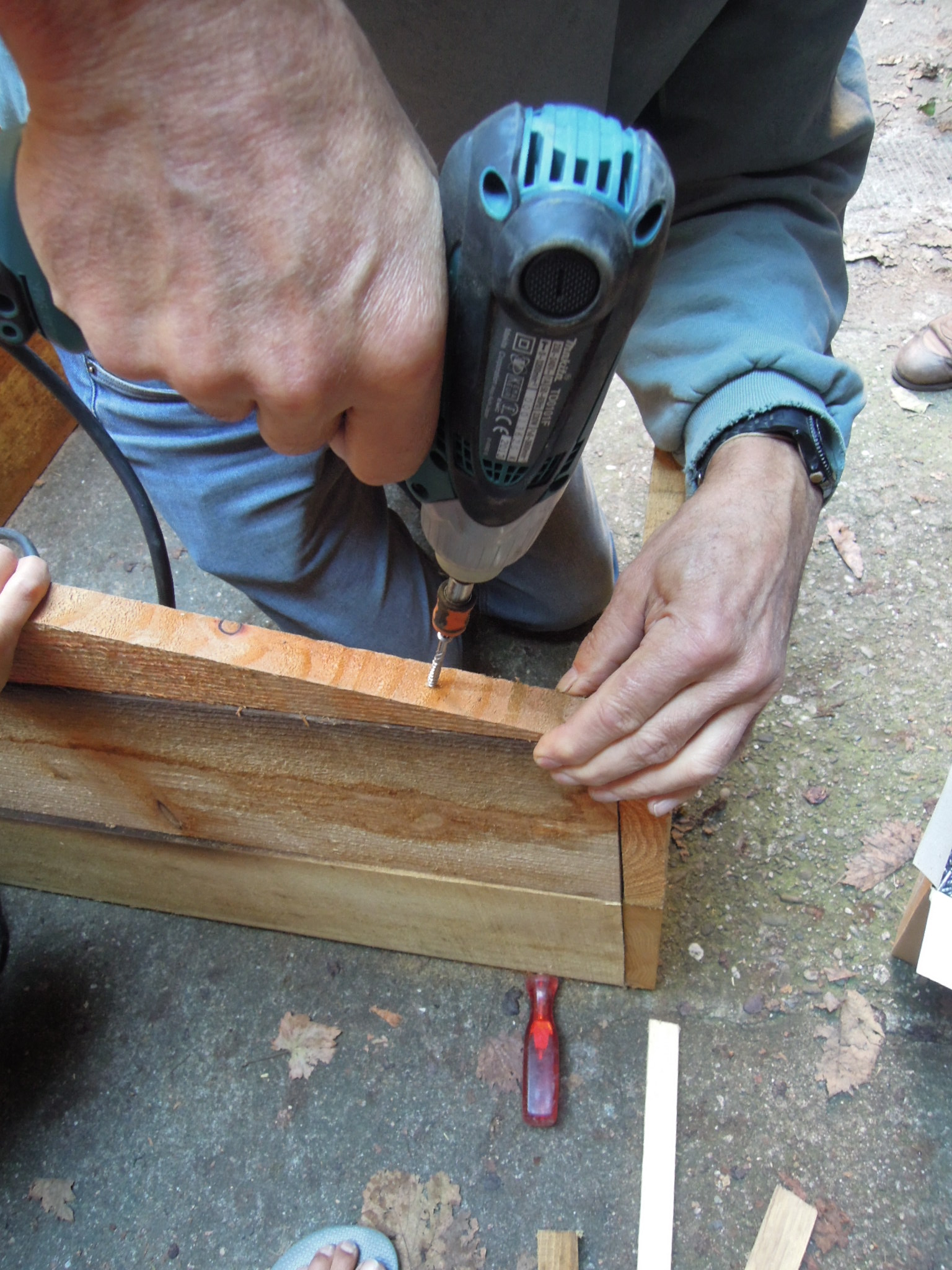 Maintenir fermement les pièces entre elles et contre elles pour ne pas avoir de jeu, et visser jusqu’à ce que les têtes des visses soient noyées, surtout pas plus.