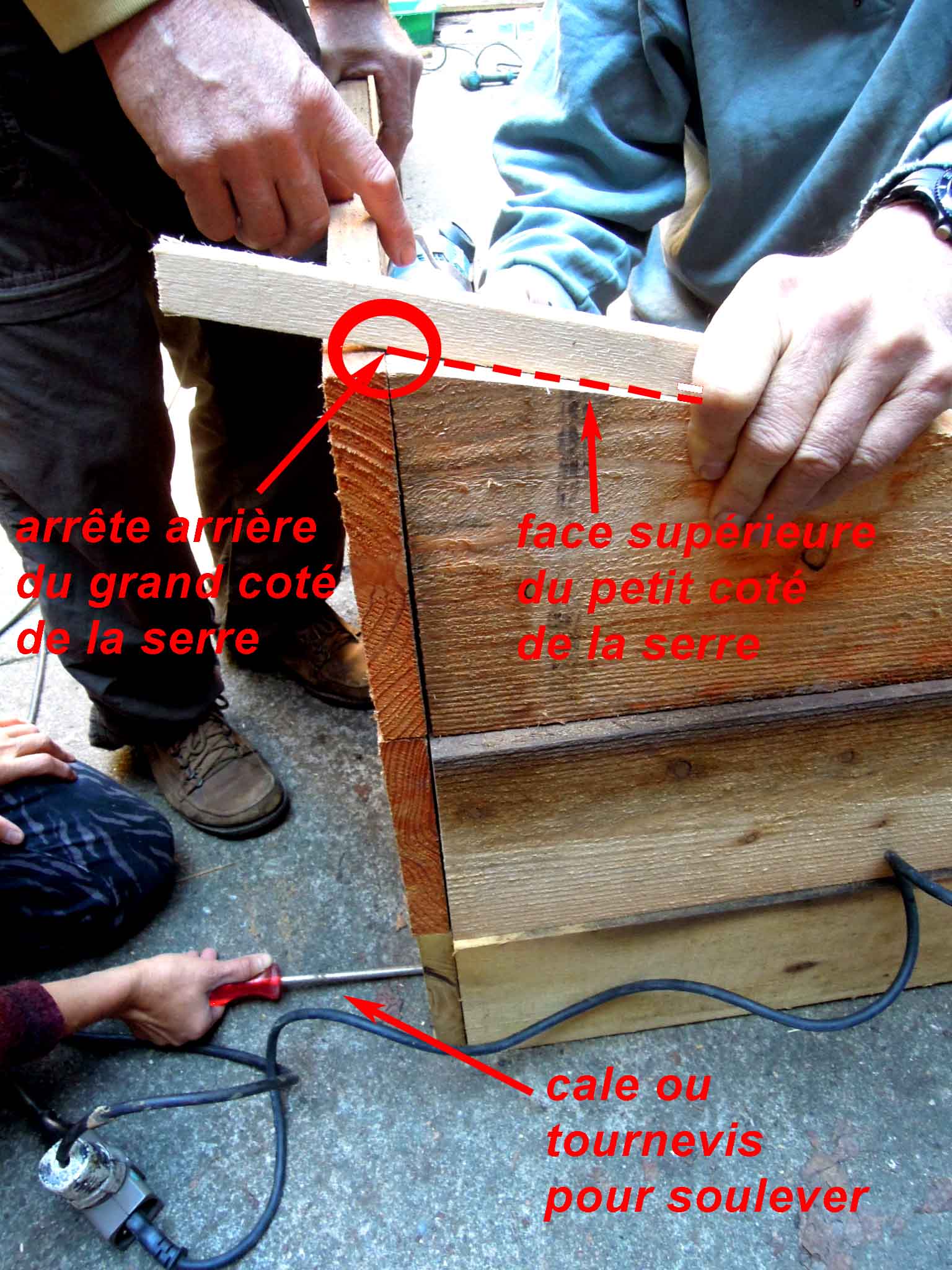 La face supérieure du petit coté des serres doit être parfaitement alignée sur l’arrête arrière (intérieure) du grand coté arrière des serres.